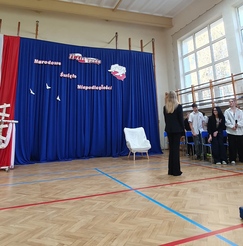 Uroczystość uświetnił występ chóru szkolnego, prowadzonego przez p. Piotra Przyrowskiego, który wprowadził podniosły nastrój, wykonując znane pieśni patriotyczne. Szczególne wzruszenie wzbudziła solistka- Zofia Gliwa, która wykonała poruszającą pieśń o żołnierzach walczących za ojczyznę. Na scenie pojawili się także uczniowie w czapkach z epoki, przypominając o bohaterach polskich powstań i legionistach marszałka Piłsudskiego.