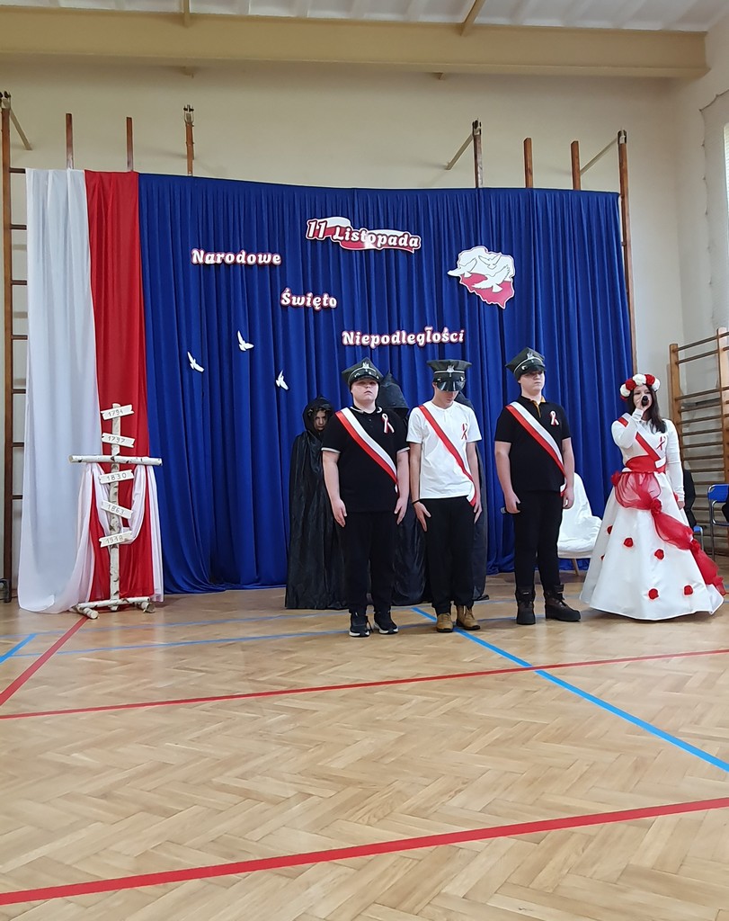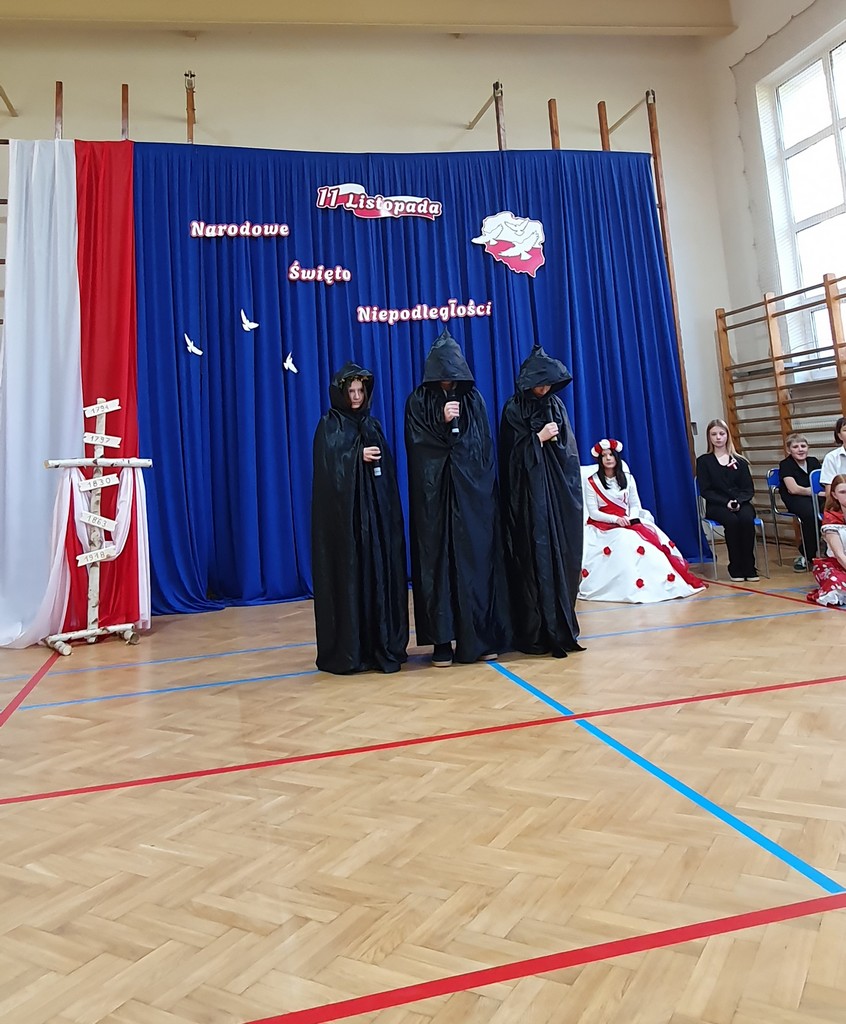 Uczniowie klasy 7b, pod kierunkiem p. Renaty Tokarskiej,  przygotowali inscenizację przedstawiającą dzieje Polski w czasie zaborów. Na scenie pojawiła się uosobiona Polska – symboliczna postać w biało-czerwonej sukni z wiankiem w narodowych barwach na głowie , a obok niej zaborcy w charakterystycznych strojach, reprezentujący trudne momenty naszej historii.