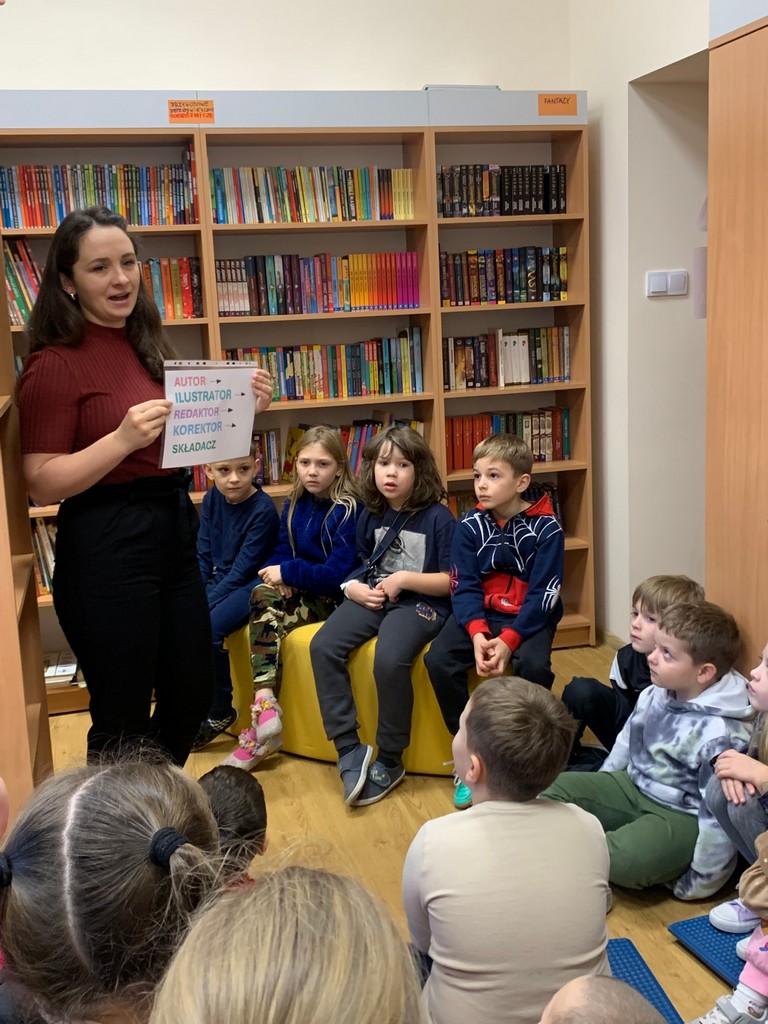 We środę, 19 listopada w bibliotece szkolnej odbyły się wyjątkowe zajęcia warsztatowe przeprowadzone przez mamę naszej uczennicy Hani, panią Karolinę Mrozek, która pracuje jako redaktor i korektor książek. Podczas spotkania pani Karolina opowiedziała dzieciom, na czym polega jej praca oraz jakie etapy przechodzi książka, zanim trafi do rąk czytelników. Uczniowie dowiedzieli się, czym zajmuje się redaktor i korektor, dlaczego poprawianie błędów jest tak ważne oraz jak wygląda praca nad tekstem.