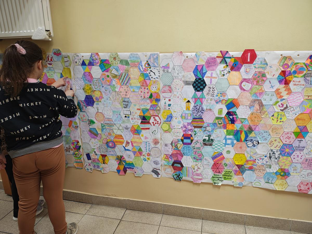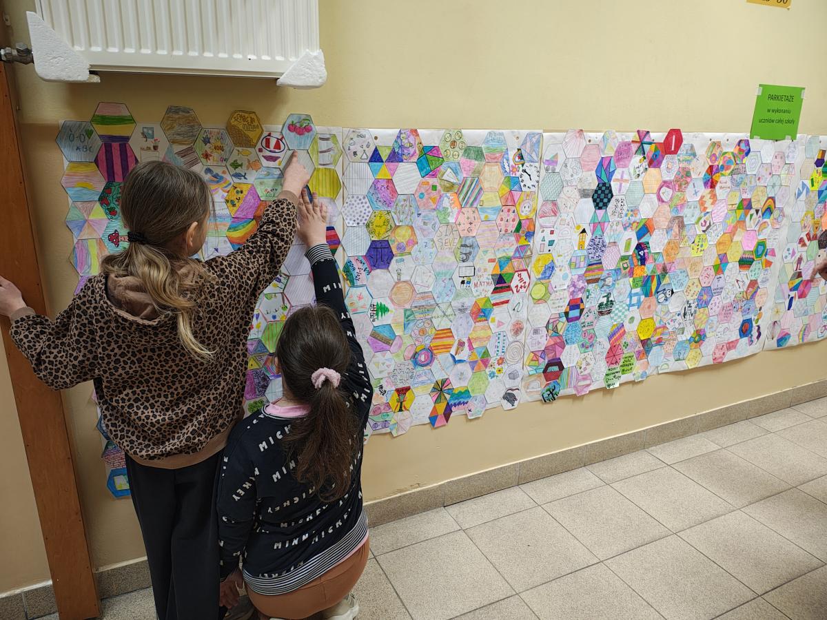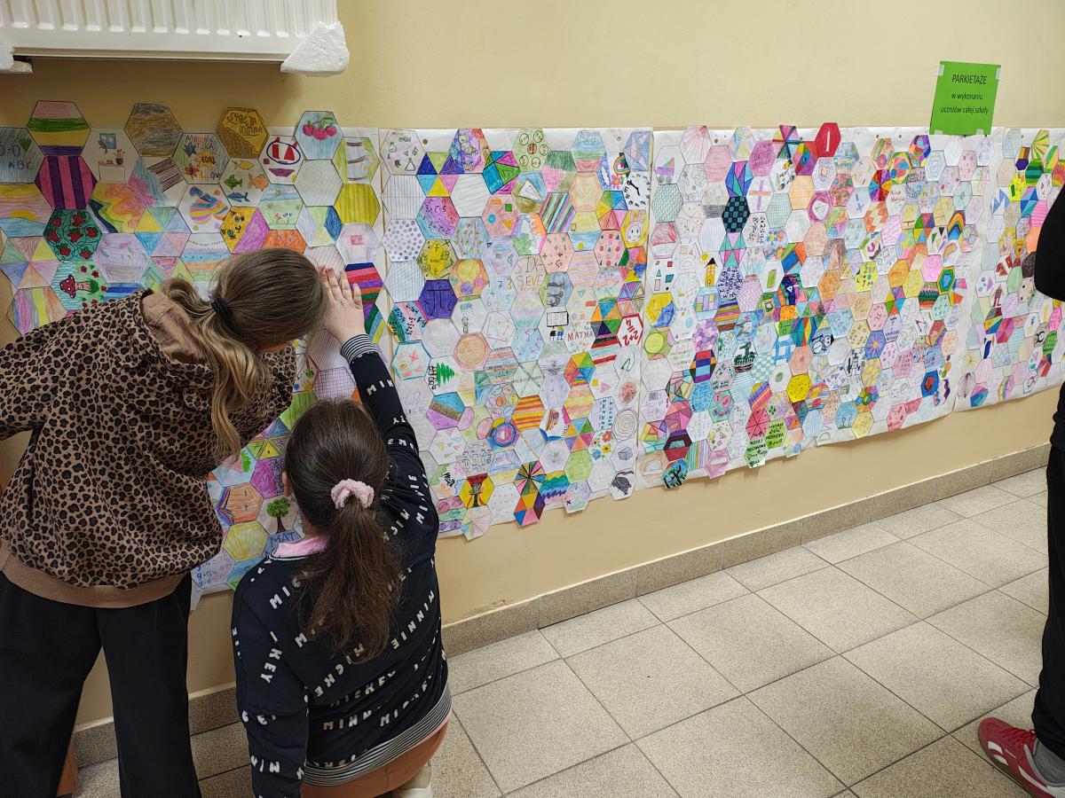 Świętowanie rozpoczęliśmy od podziwiania prac projektowych: „Geometrycznego Zwierzyńca” klas 1–3 oraz makiet „Matematycznej Krainy” i komiksów przygotowanych przez starszych uczniów. Wyjątkowym elementem był Szkolny Parkietaż – każda klasa przygotowała własne „puzzle”, które połączone na głównym korytarzu stworzyły imponujący, wspólny wzór.